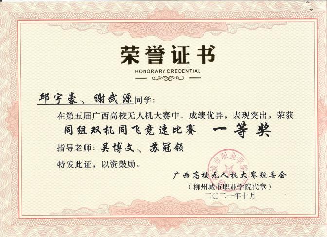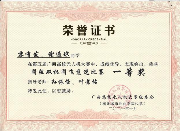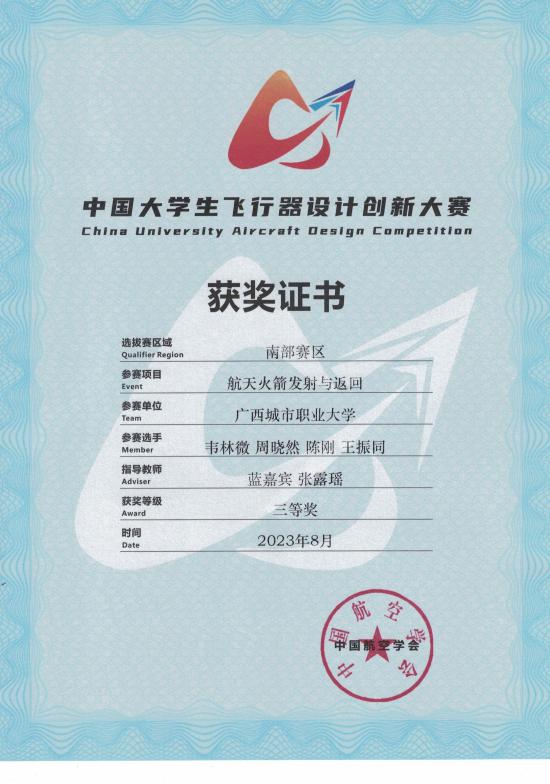近年来,本专业教师曾指导学生参加中国大学生飞行器设计创新大赛、广西高校无人机大赛、第二十四届中国机器人及人工智能大赛、广西职业院校技能大赛等各级竞赛,获得国家级、区级一等奖、二等奖、三等奖多项。