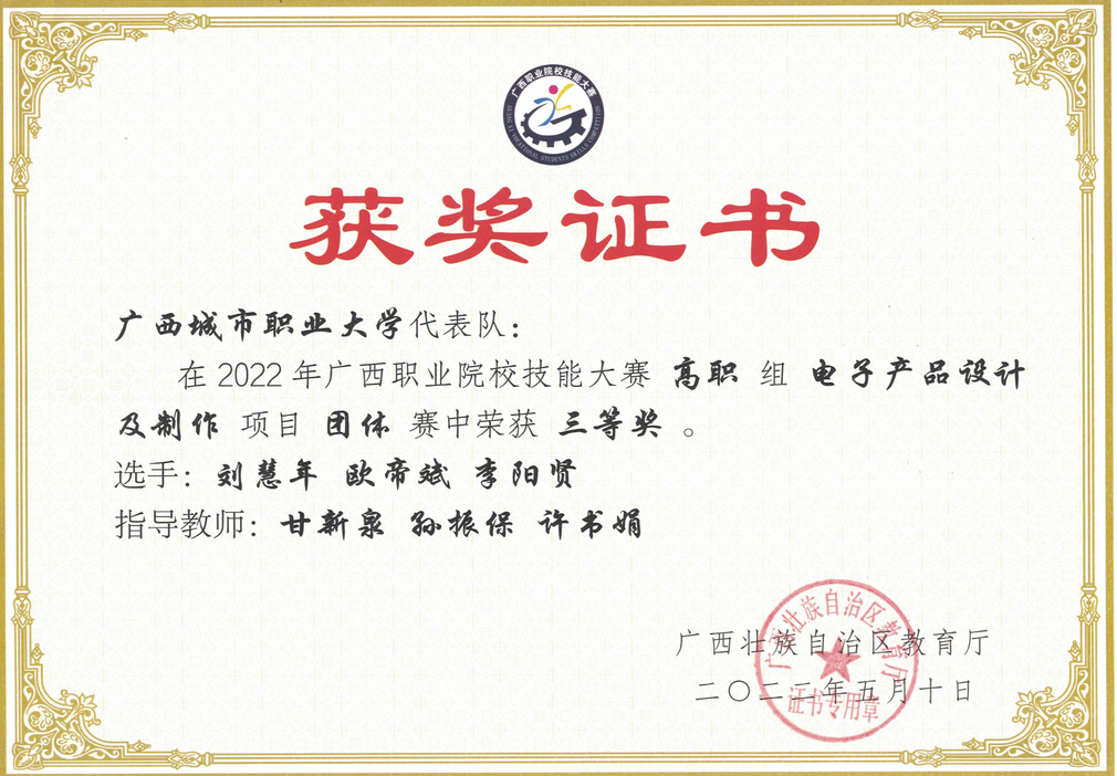 近年来,本专业教师曾指导学生参加第二十四届中国机器人及人工智能大赛、广西大学生电子设计大赛、广西职业院校技能大赛等各级竞赛获奖共计4项,其中国家级1项,自治区级2项,行业企业比赛1项。
